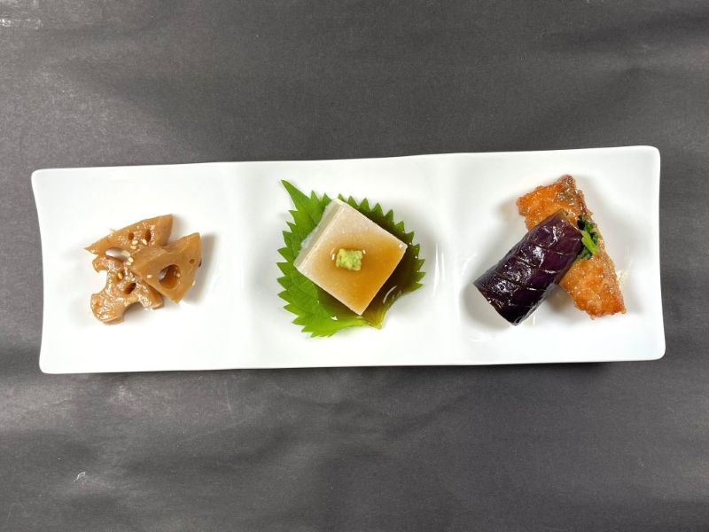 (写真は、きんぴらレンコン・そば豆腐・秋鮭の南蛮漬)