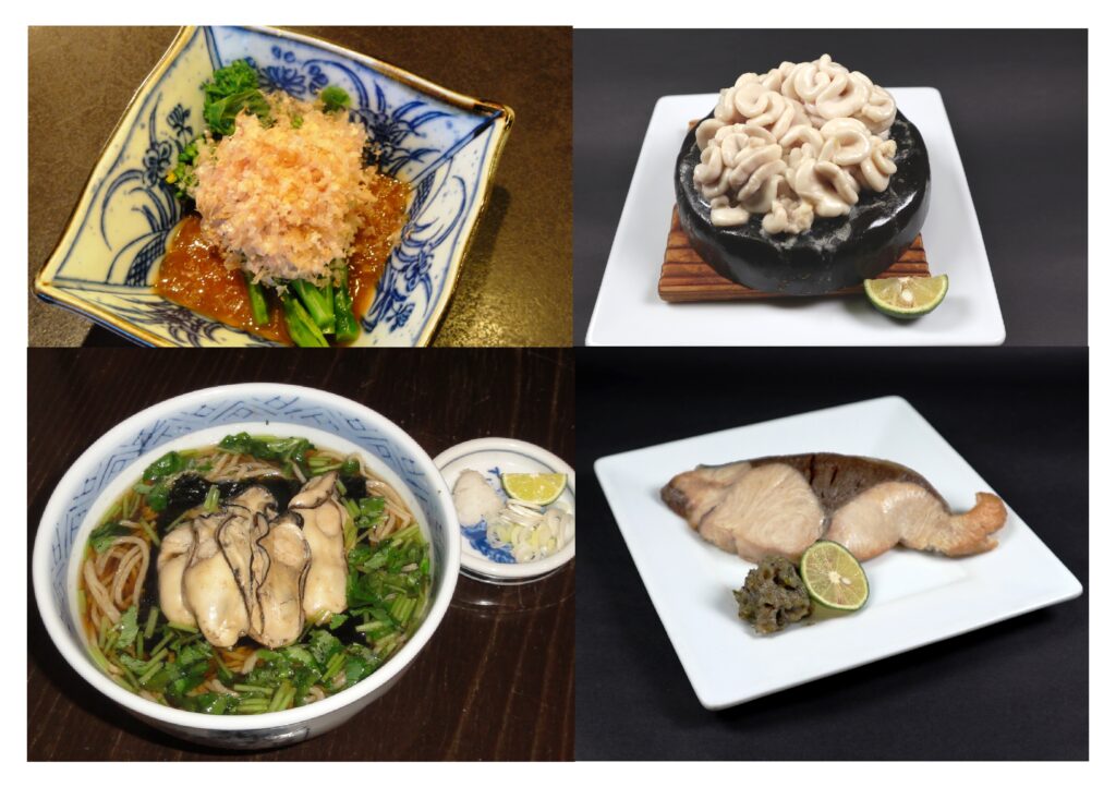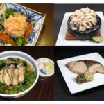 (写真は、菜の花辛し和え・そば豆腐・ブリとセリの煮浸し)