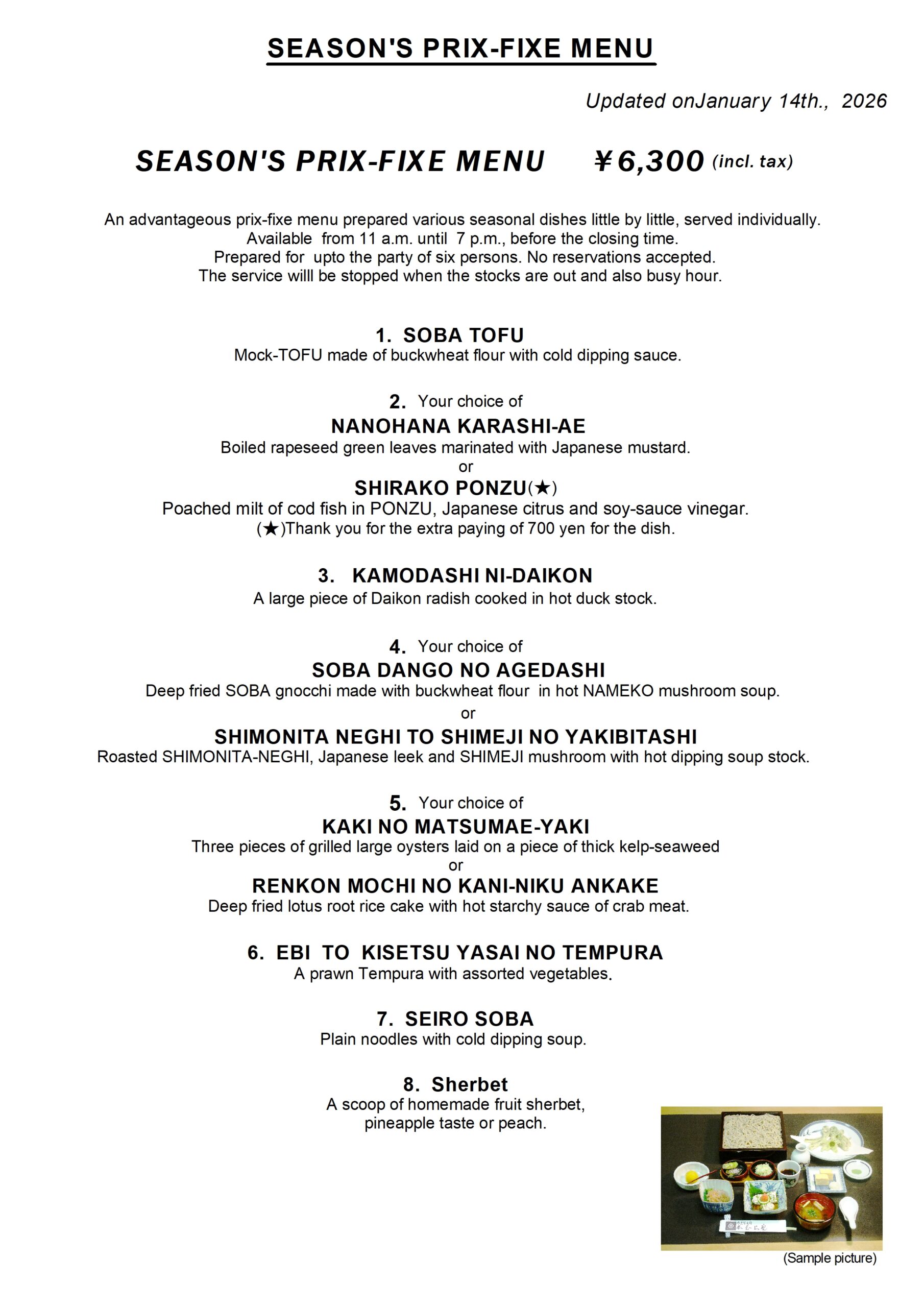 Prepared up to the party of six persons. No reservations accepted.