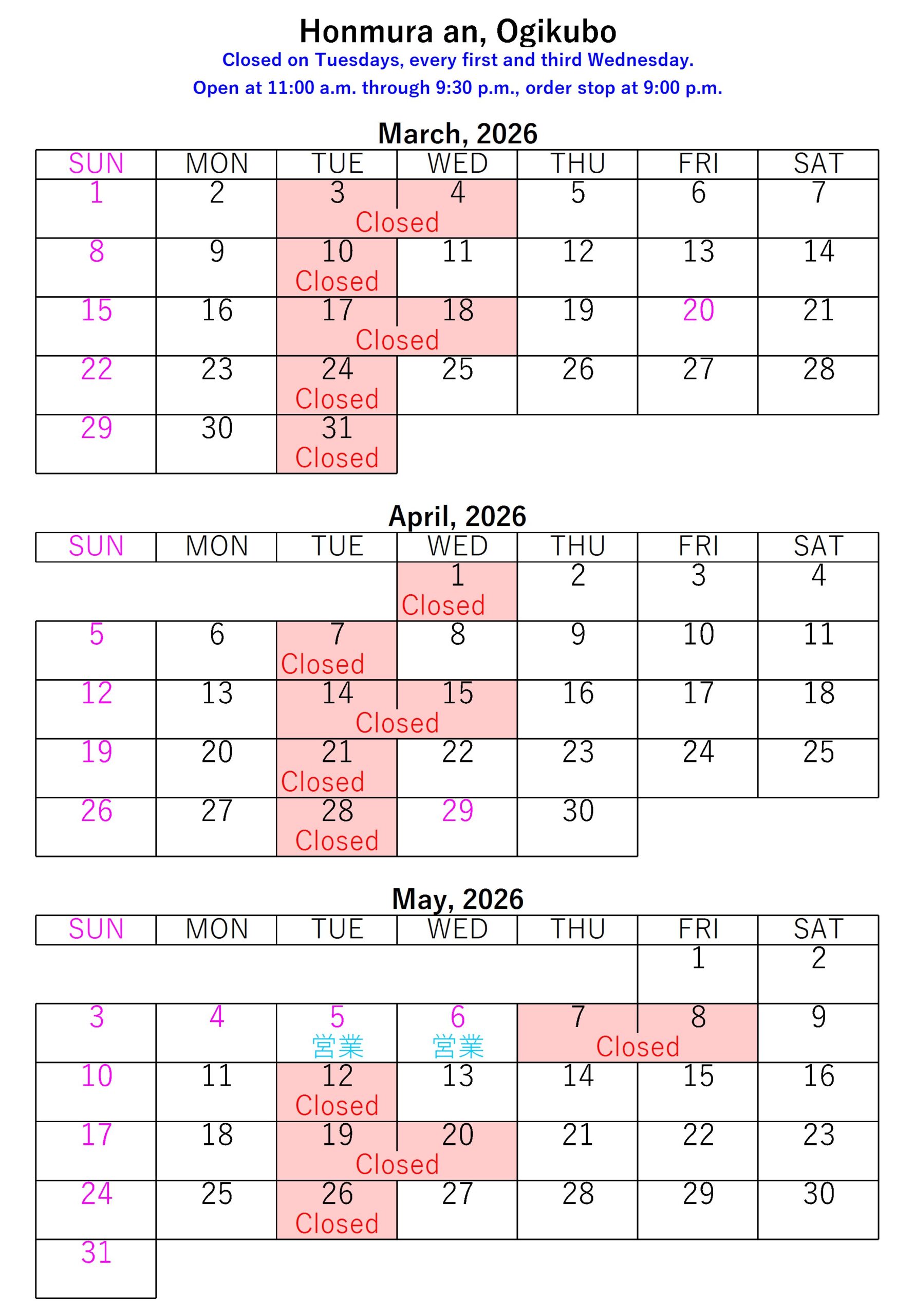 ・The regular closing days are every Tuesday, first and third Wednesday except holidays.