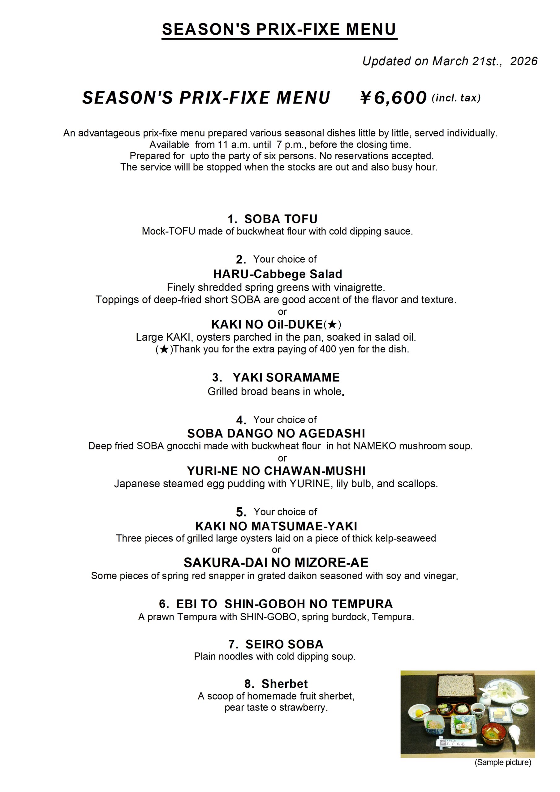 Prepared up to the party of six persons. No reservations accepted.