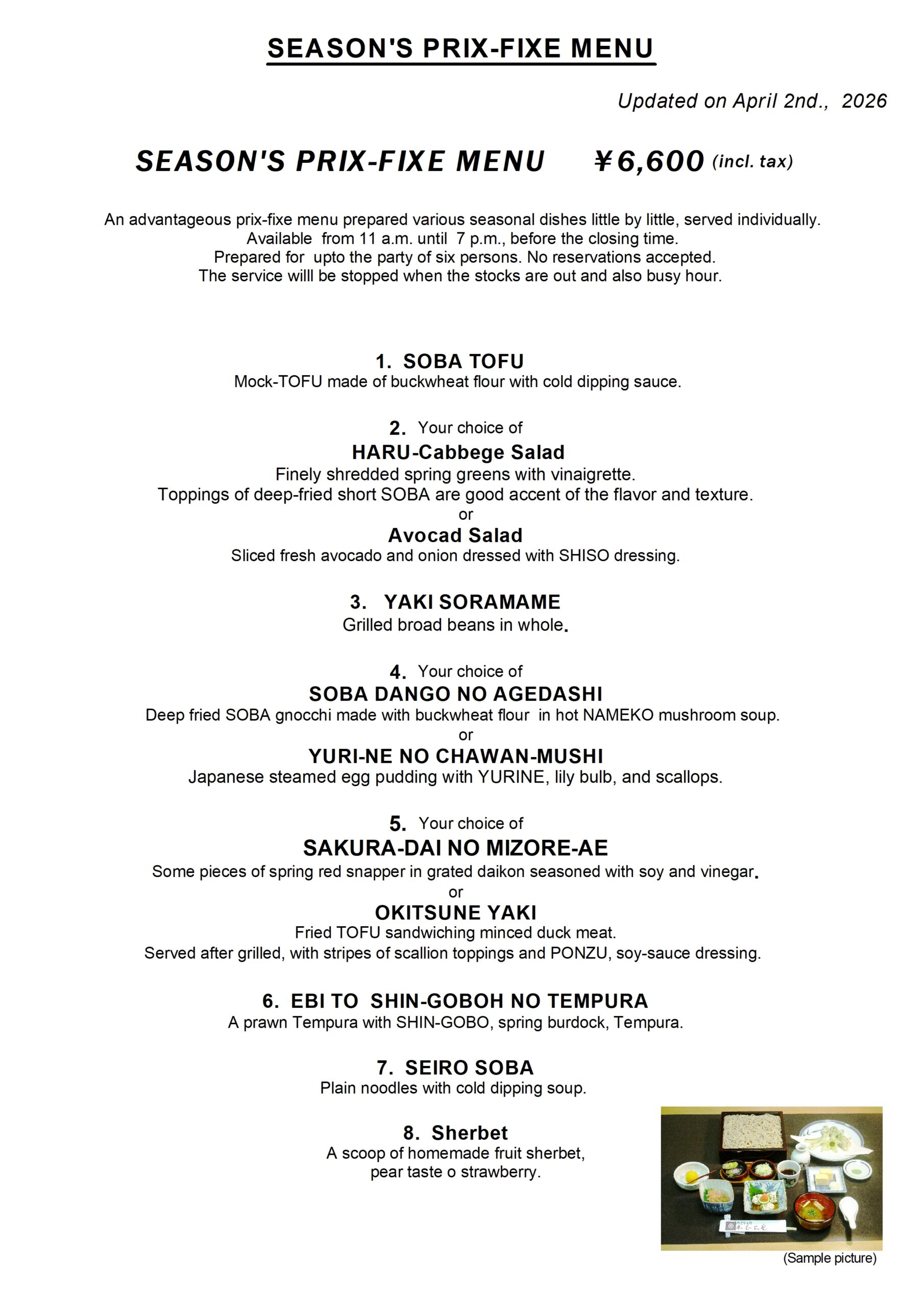 Prepared up to the party of six persons. No reservations accepted.