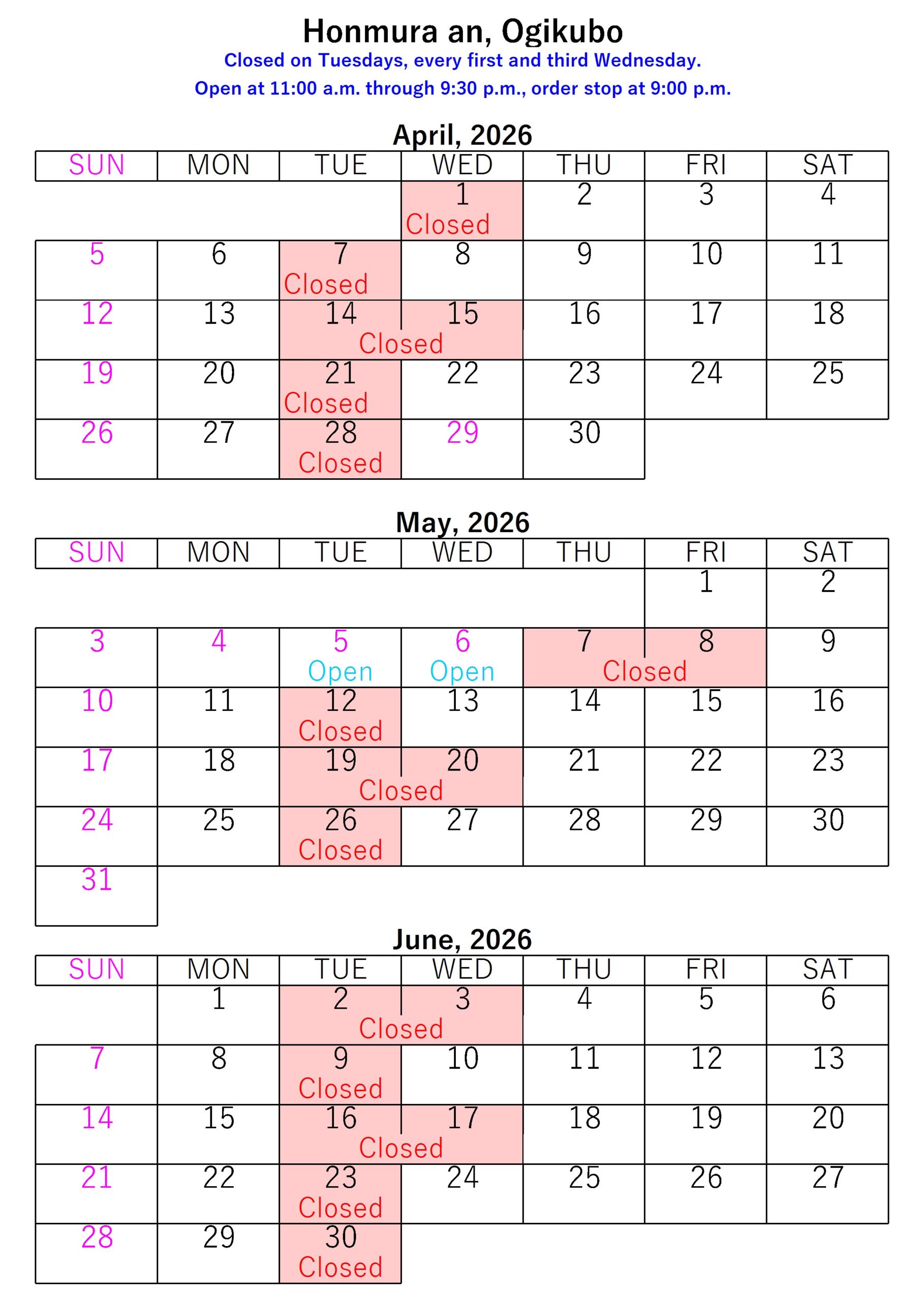 ・The regular closing days are every Tuesday, first and third Wednesday except holidays.