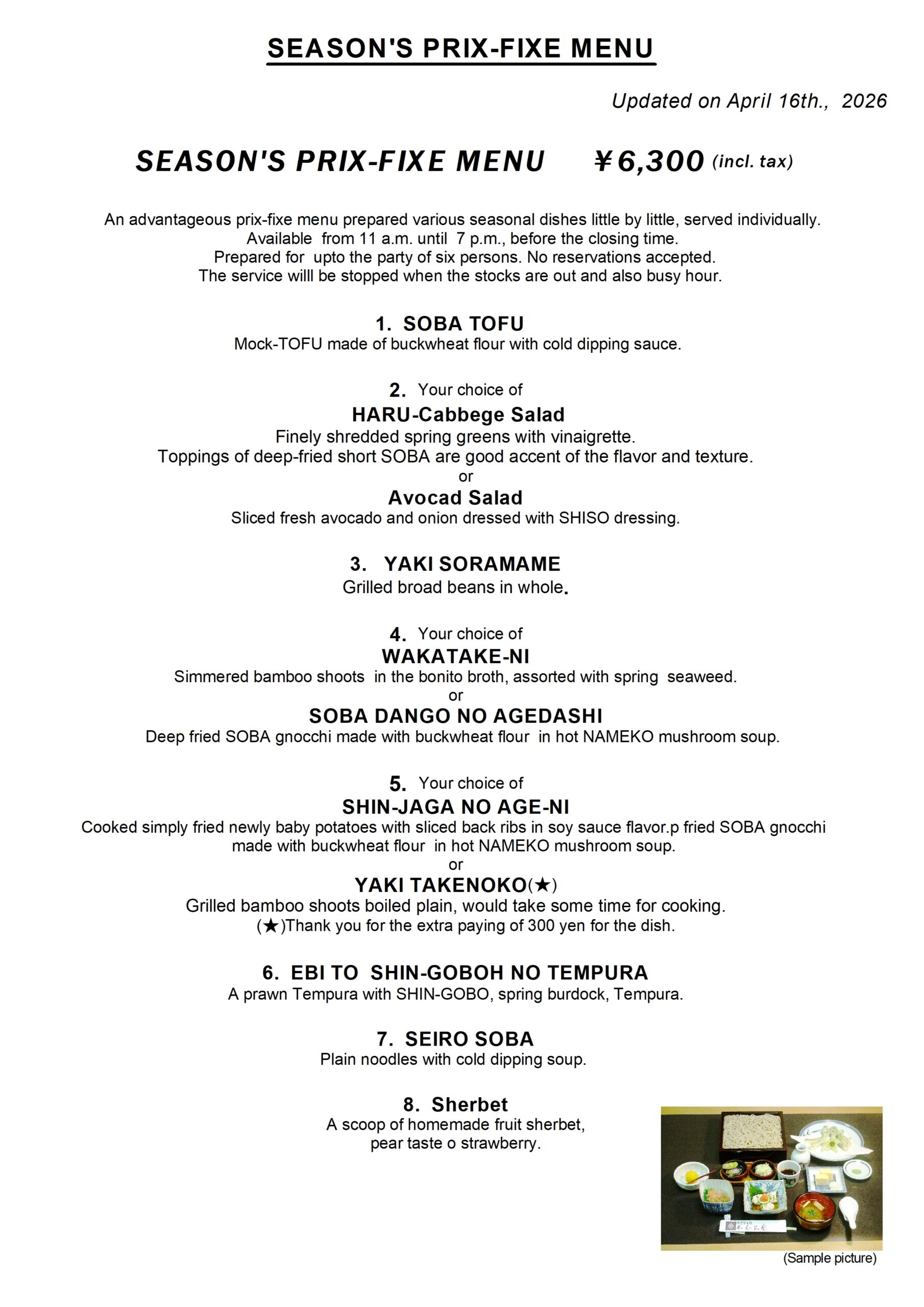Prepared up to the party of six persons. No reservations accepted.