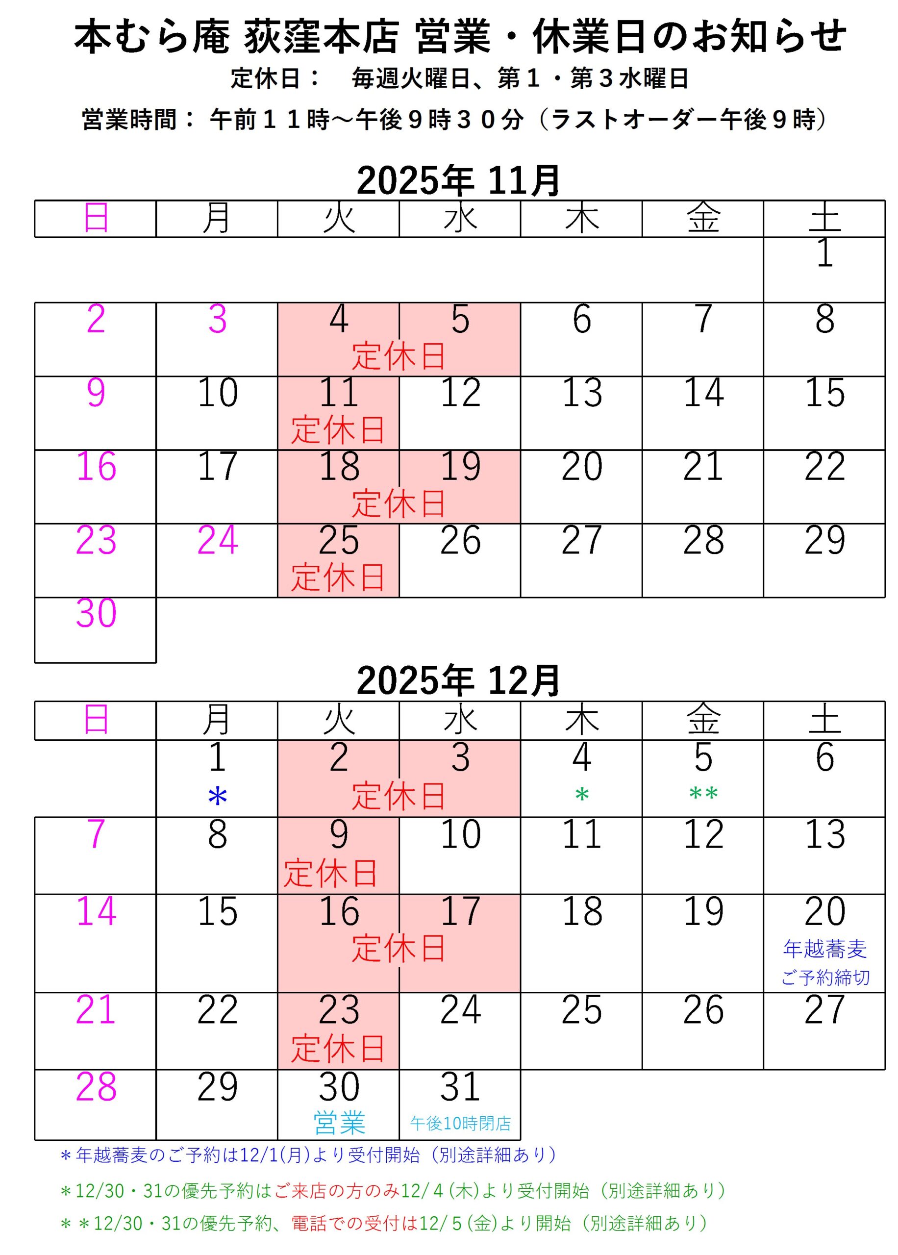 更新:’25年 11月・12月・’26年 1月 営業のお知らせ