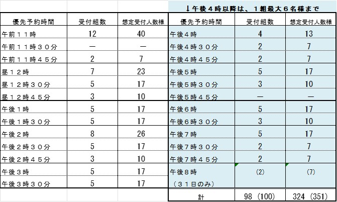 ・ 30日・31日の午後4時以降の優先予約は、1組最大6名様(お子様含む)となります。