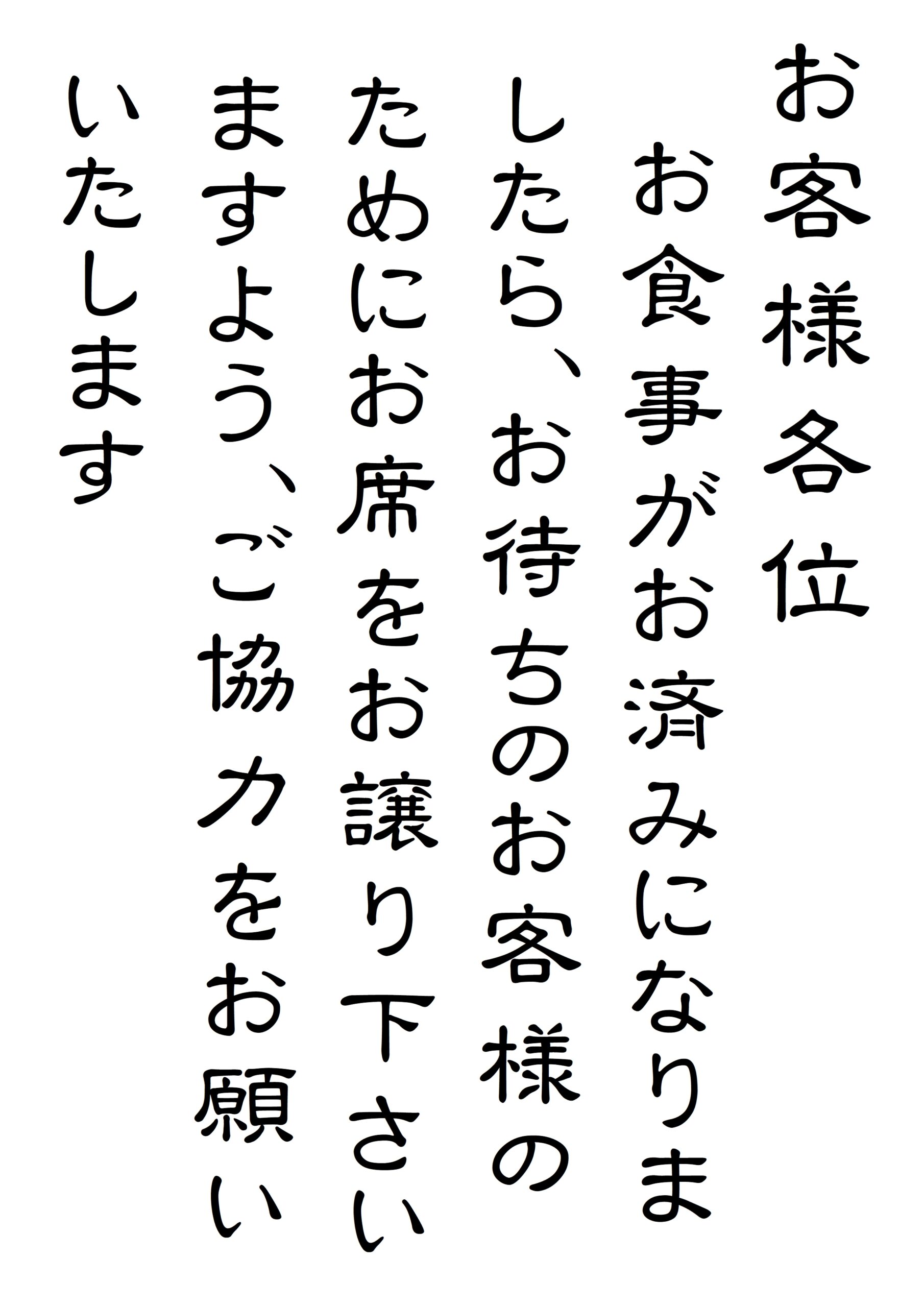 両日とも混雑が予想されます。お食事がお済のお客様は、速やかにお席をお譲りくださいませ。