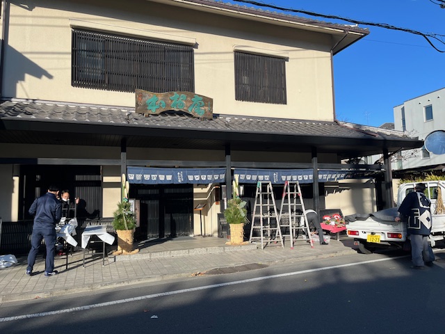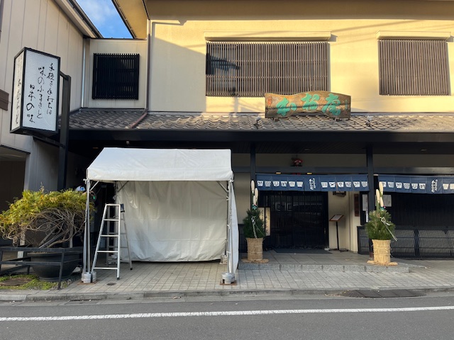 ↓ 店頭では、門松の脇で大晦日年越しそばお引き取り専用テントの設営