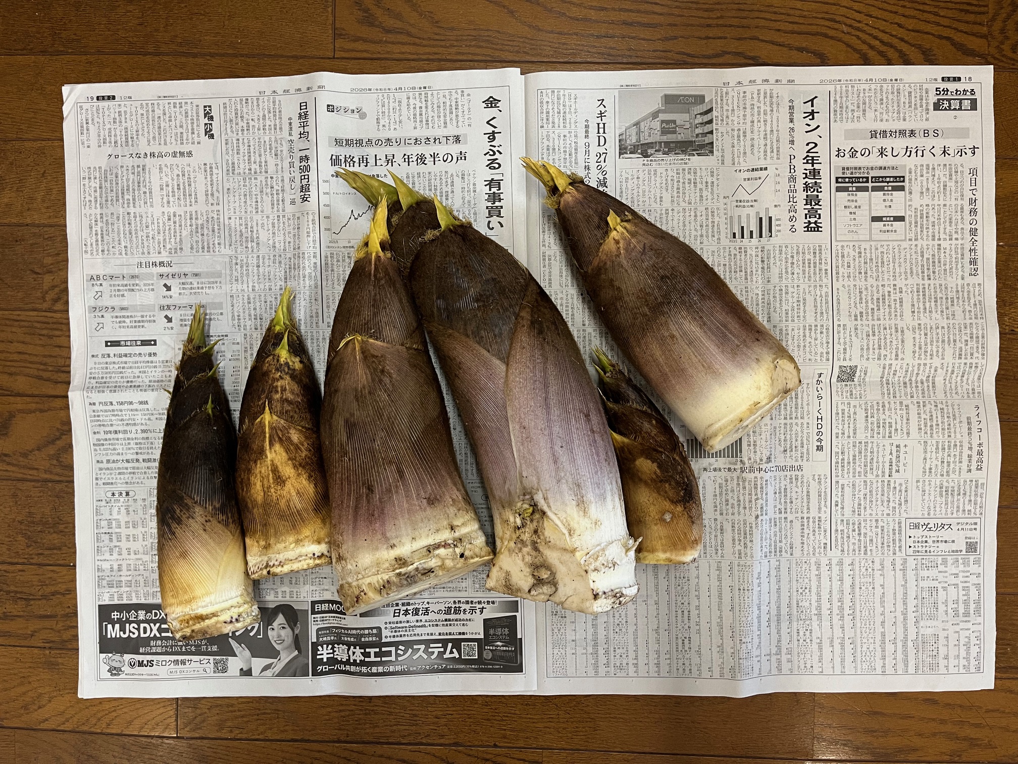 落ち込んでいたところ、区内の親戚から自宅の竹林(スゴッ)で朝堀りのタケノコ6本の差入れ~~(#^.^#)!